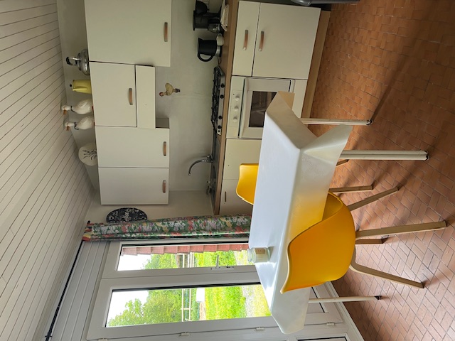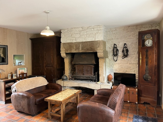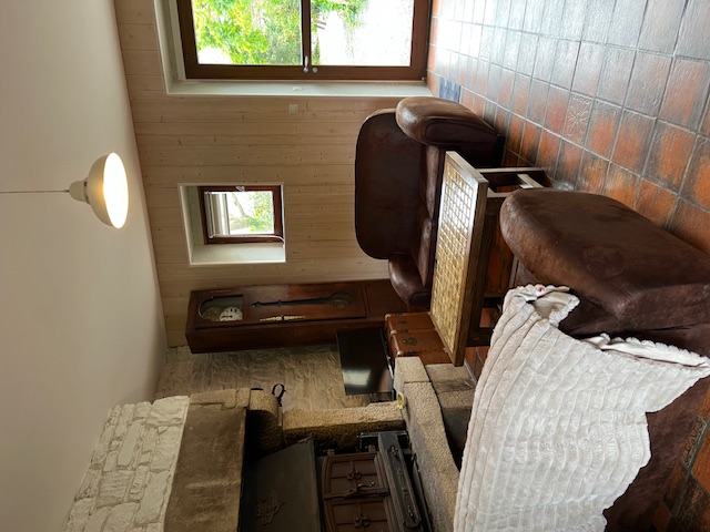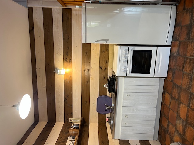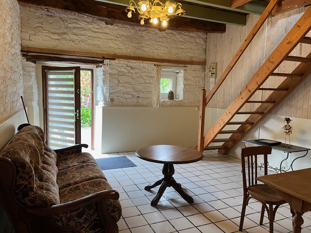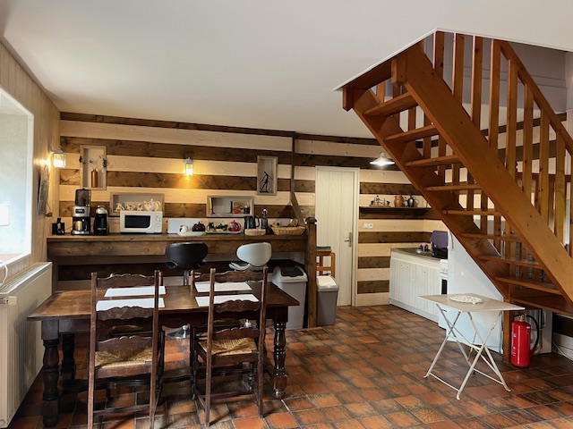 – au rez-de-chaussée : séjour, cheminée (bois fourni), espace repas, kitchenette, salle d’eau (douche italienne, lavabo, wc)
