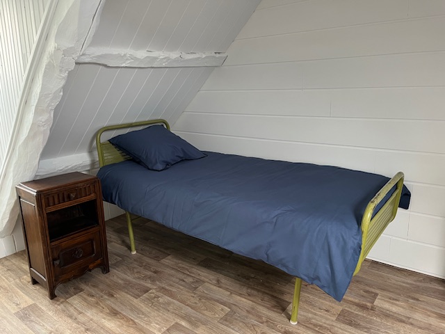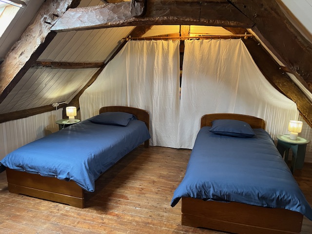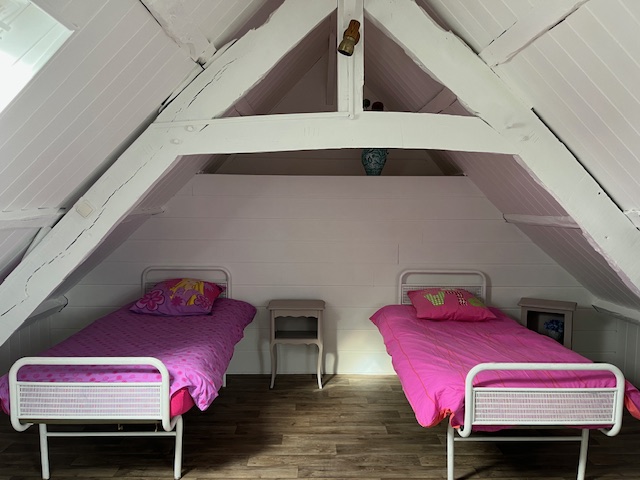 – à l’étage : 1 chambre en mezzanine, 3 lits simples (les lits sont faits)