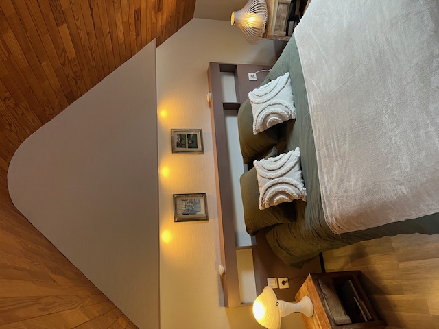 – à l’étage : 1 chambre en mezzanine avec 1 lit double (140 cm), communicante avec 1 seconde chambre équipée de 2 lits simples (90cm)