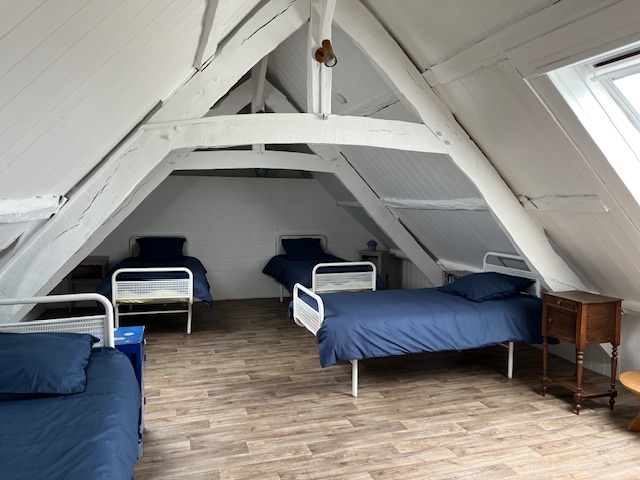 – à l’étage : 1 dortoir en 3 parties, 7 lits simples (les lits sont faits)